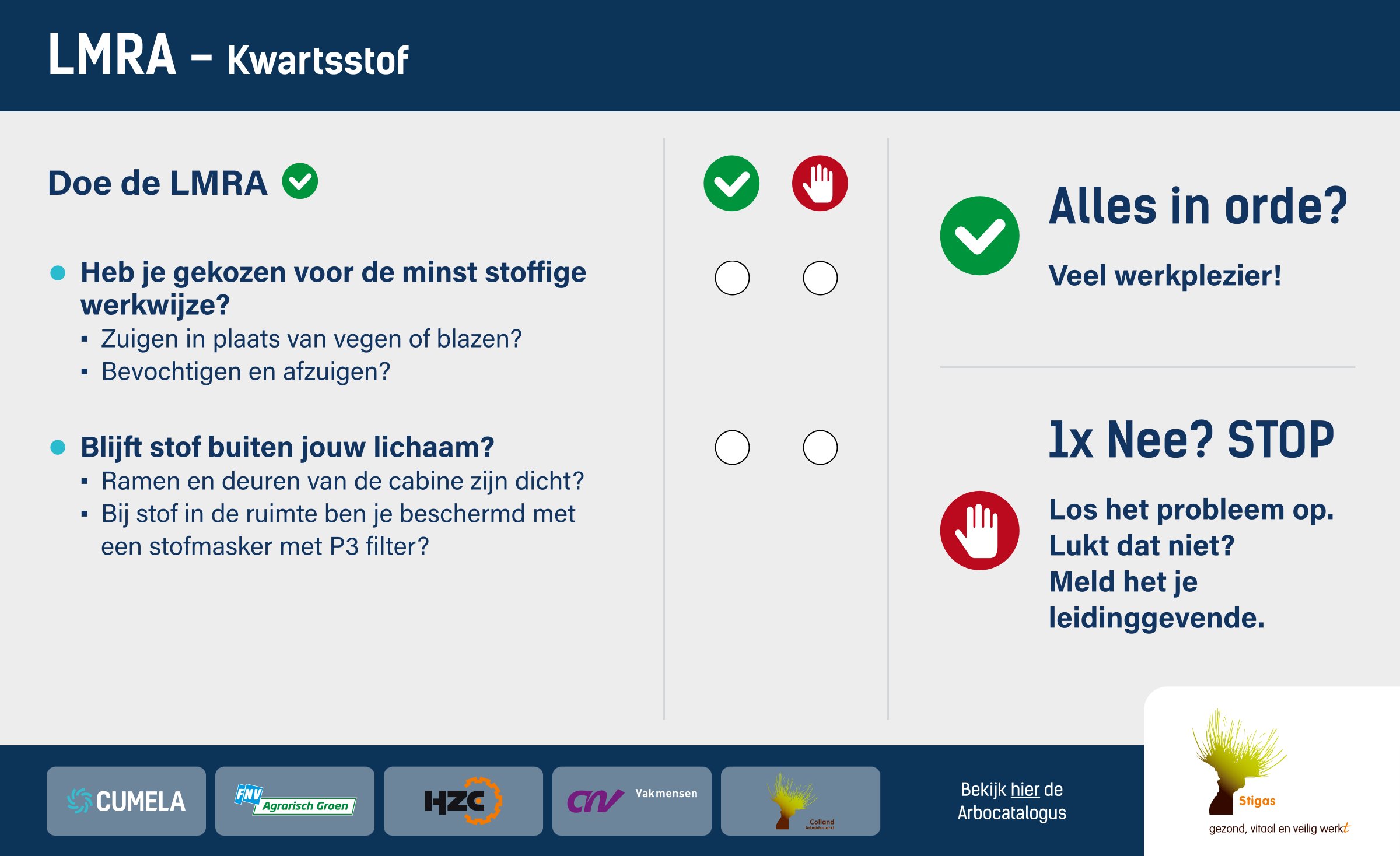 - Zorg dat de blootstelling aan kwartsstof zo laag mogelijk blijft. Ook als de grenswaarden niet overschreden zijn, vanwege het kankerverwekkend karakter van kwartsstof, alle mogelijke maatregelen vereist om blootstelling te voorkomen of te beperken.