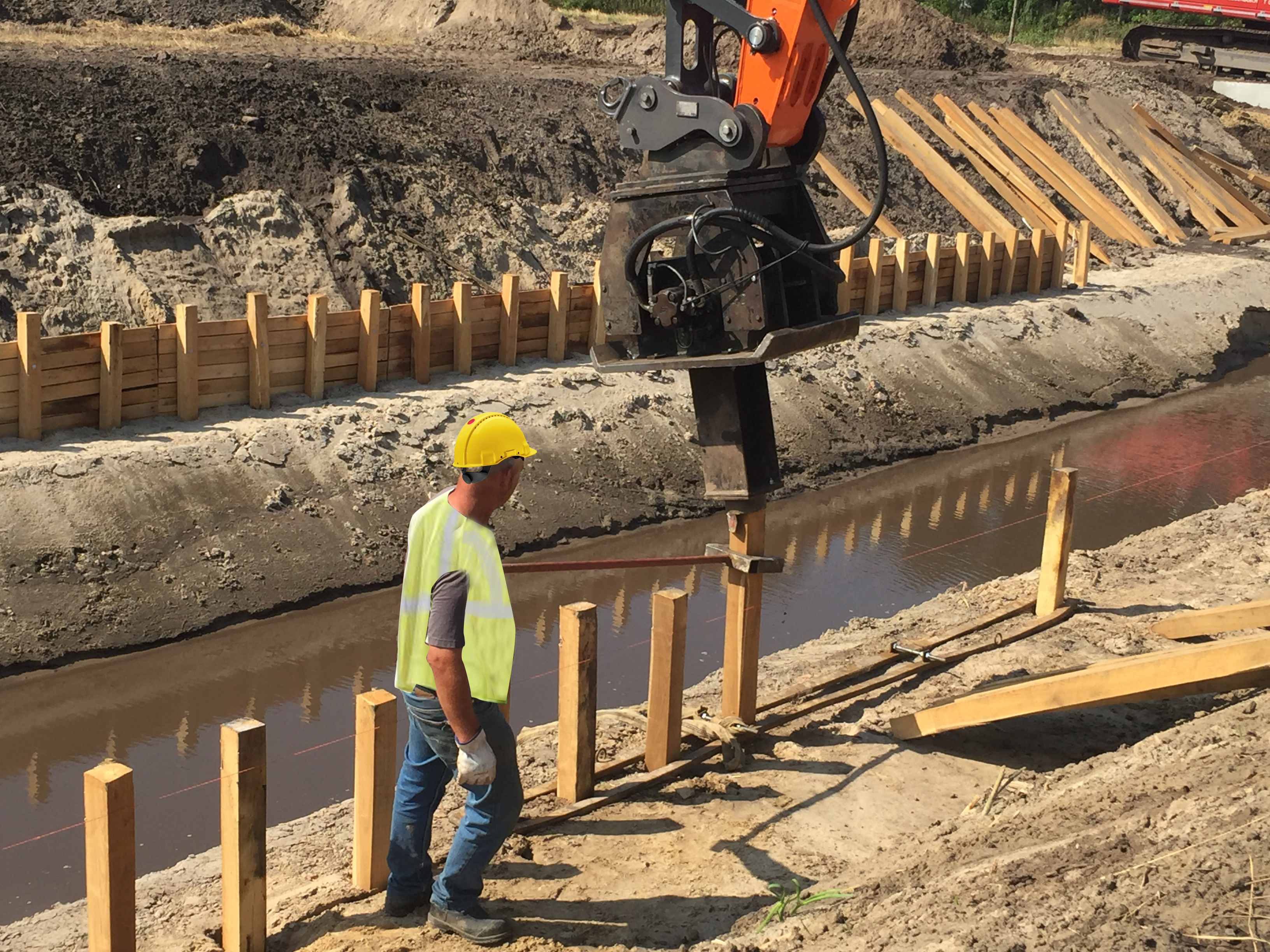 Voorbeeld van een juiste aansluiting. bron Verachtert - Laat medewerkers een "afduwer / geleider" gebruiken bij het begeleiden van palen die door middel van een trilblok gezet moeten worden.
