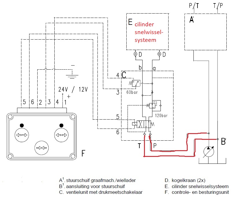 - Sluit de hydrauliekaansluiting van het snelwisselsysteem niet aan op het ventielenblok (vertakken). Monteer de hydrauliekslangen ten behoeve van het snelwisselsysteem direct op de daarvoor bestemde en geschikte aansluiting.