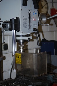 - Plak een sticker waarop staat dat het dragen van veiligheidsschoenen, een veiligheidsbril en gehoorbescherming verplicht is bij het werken met de metaalafkortzaag, draaibank, kolomboor en vaste slijpmachine. En dat het dragen van handschoenen bij het werken aan een draaibank en kolomboor verboden is.