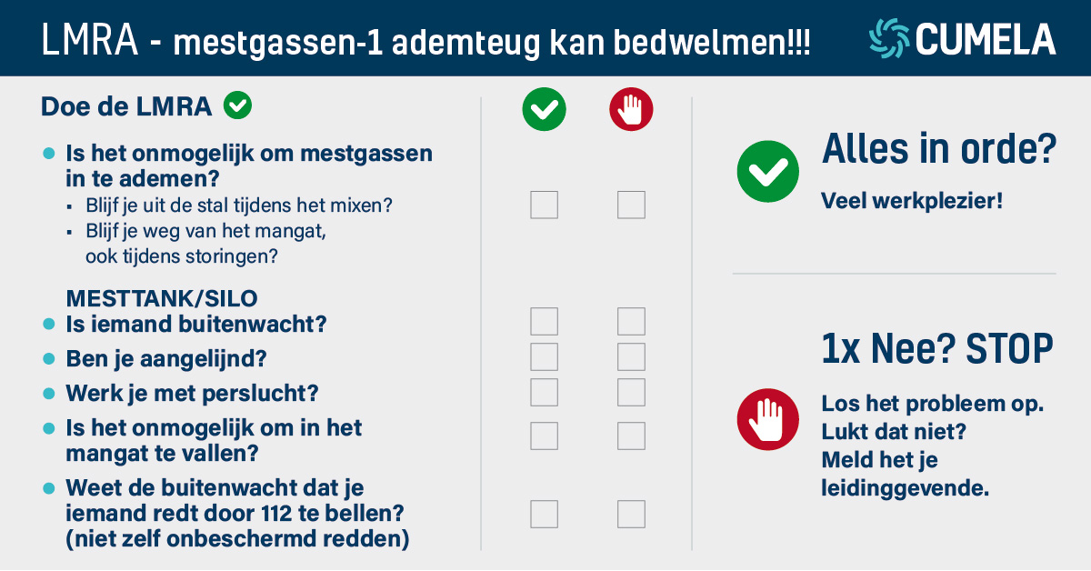 - Gebruik de checklist voordat je begint te werken: LMRA mestgassen (een initiatief van CUMELA Nederland)